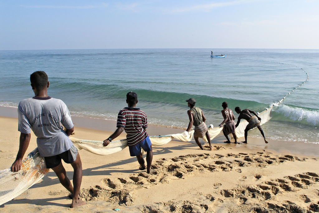 fishermen at the beach of Batticaloa, Sri Lanka. the men in the boat have laid out the net in an almost perfect semi-circle. now the men on the shore prepare to tow the net in.
