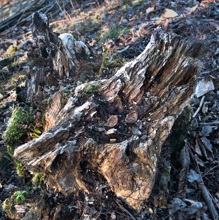 I found this behind my house on a steep slope. I love the cool colors of the shadow and the play of the sunlight that came through still the bleak trees