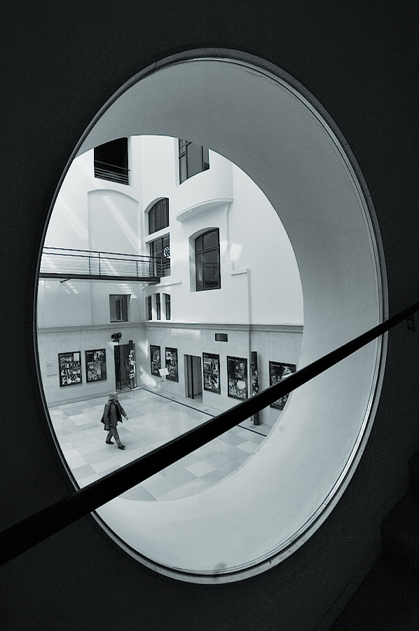 so this title might attract some traffic (makes me grin, as I will go to great efforts in order to avoid having to use this), but it’s just the correct translation for the german „durchblick“. i found this view in the bavarian chamber of industry and commerce in munich. their building has a really nice patio, and from the round windows of the stairway i had this look down to the ground floor.