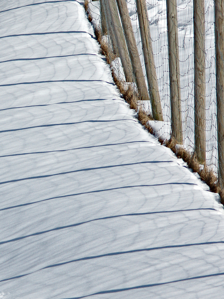a lesson in ‚learning to see‘. i had a bland image on my monitor, taken when i was quite tired at the end of an excursion with the family. i remembered that i had taken it because of the beautiful curve of the fence posts and the shadow curves of the fence’s wire, but there was too much optical garbage clobbering the real subject. so out of a 12.7 MB file i cropped 1.5 MB, the resolution of a 2 year old mobile phone camera…