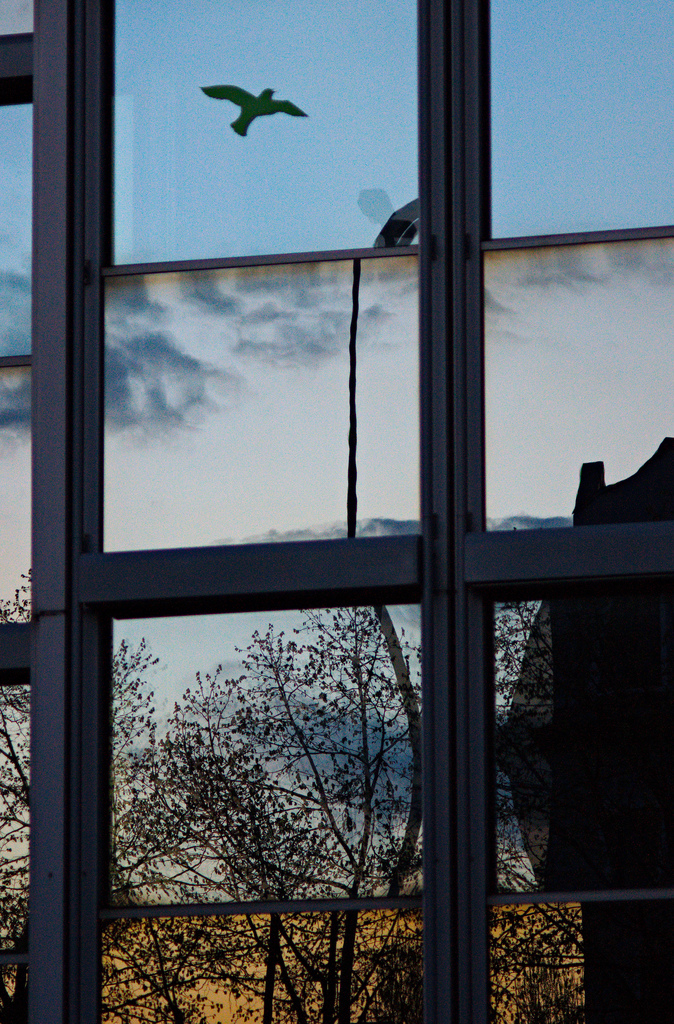 yesterday was commuting day. spring in the city is so different and, at least for me, partially depressing when the songs of the birds mingle with the traffic noise. but optically it has it’s merits, translating trees into patterns, creating trompe l’oeil like bird silhouettes, bending straight lines, mixing coating colors of the glass with the most wonderful blue of the sky (bavaria, you may know, is very proud of its skies)