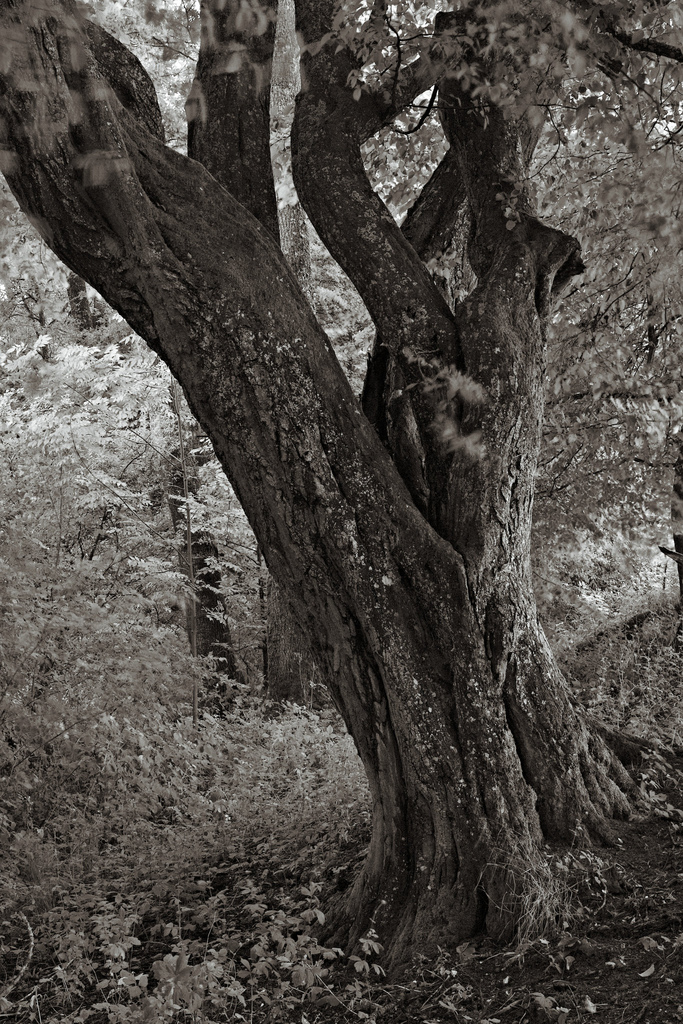 sometimes 30 minutes can be sufficient: a walk alone in grey, wet weather at the borders of a lake, a short view in the woods and the silhouette of an old strong tree. Of course it was dark in there and so i was glad for my tripod. the polarizer had to help avoid too bright reflections from the leaves. the final imaged showed an intense green, but not in as many variations as i had hoped for a strong picture, so i took my chance in the conversion to b&w and some toning.