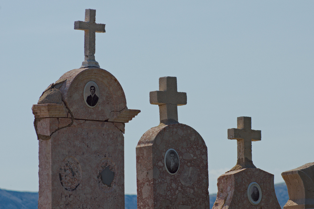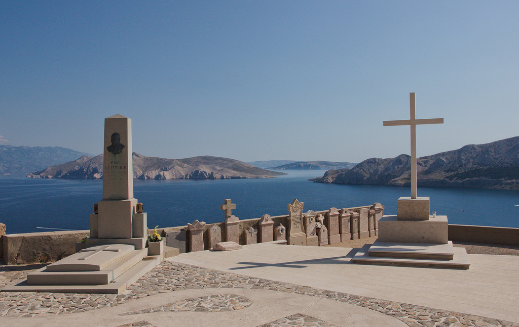 the overview from the cemetery shows the bay of baska, impressive with those steep mountains on the surrounding islands. the port lost its importance as a protected bay for sailing vessels with the arrivals of the steamers that only headed for krk on krk. now tourism is the major source of income here, after the vineyards have been devastated during the socialist regime.