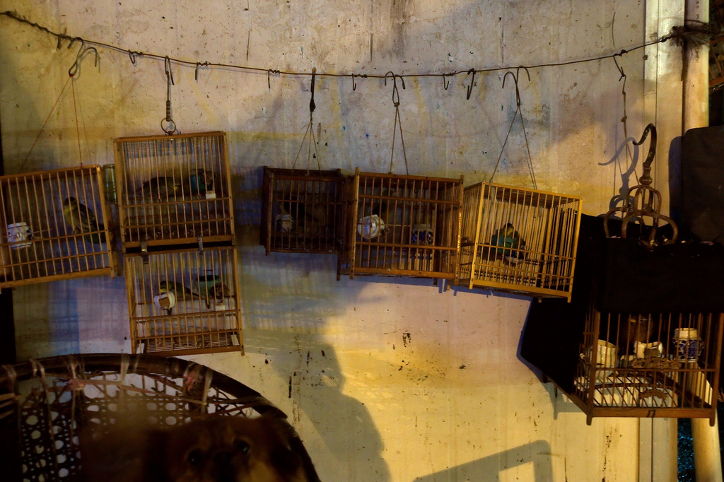 not only the people have transferred a lot of activities to the street, also the pets sometimes live out in the open. carefully taking a picture of those birds in cages, to my utter shock the dog started to bark at me. i should keep the not-on-the-viewfinder eye open…