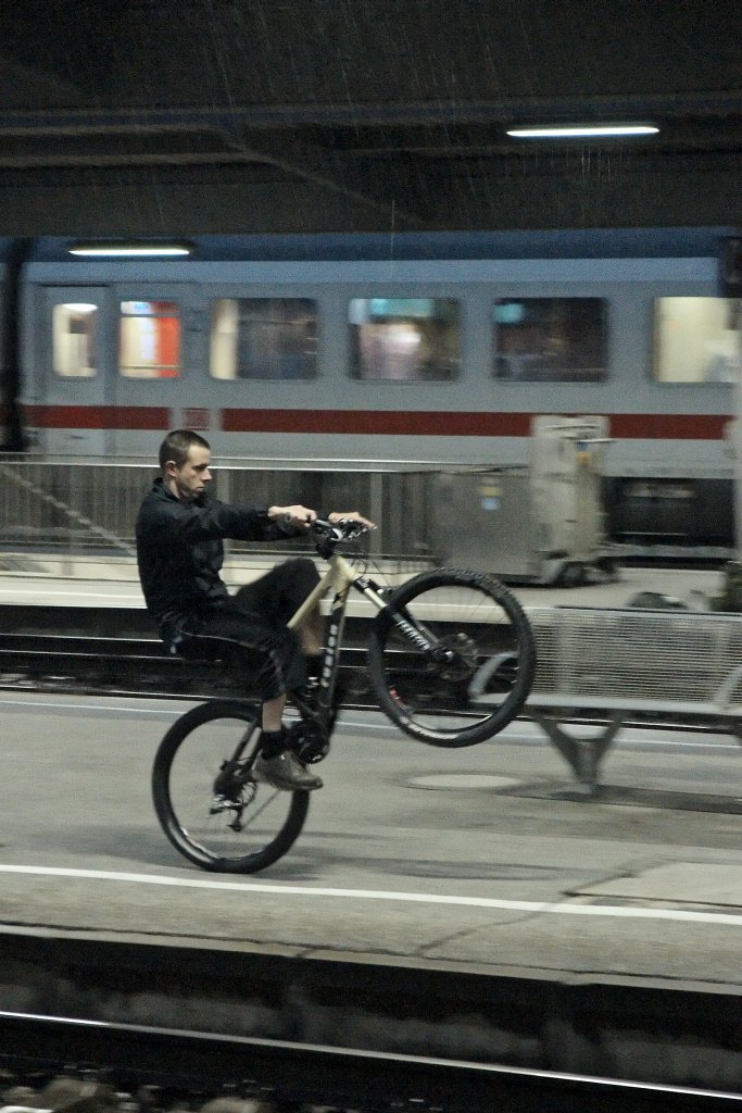 travellers in upcoming storm(3) and when that guy on the next platform started his wheelies in the dry zone under the roof, just stopping before he got out into the rain, i was fascinated enough to forget about my anger and switch my camera to those fine iso 6400, not fast enough to stop his motion but sufficient for panning.