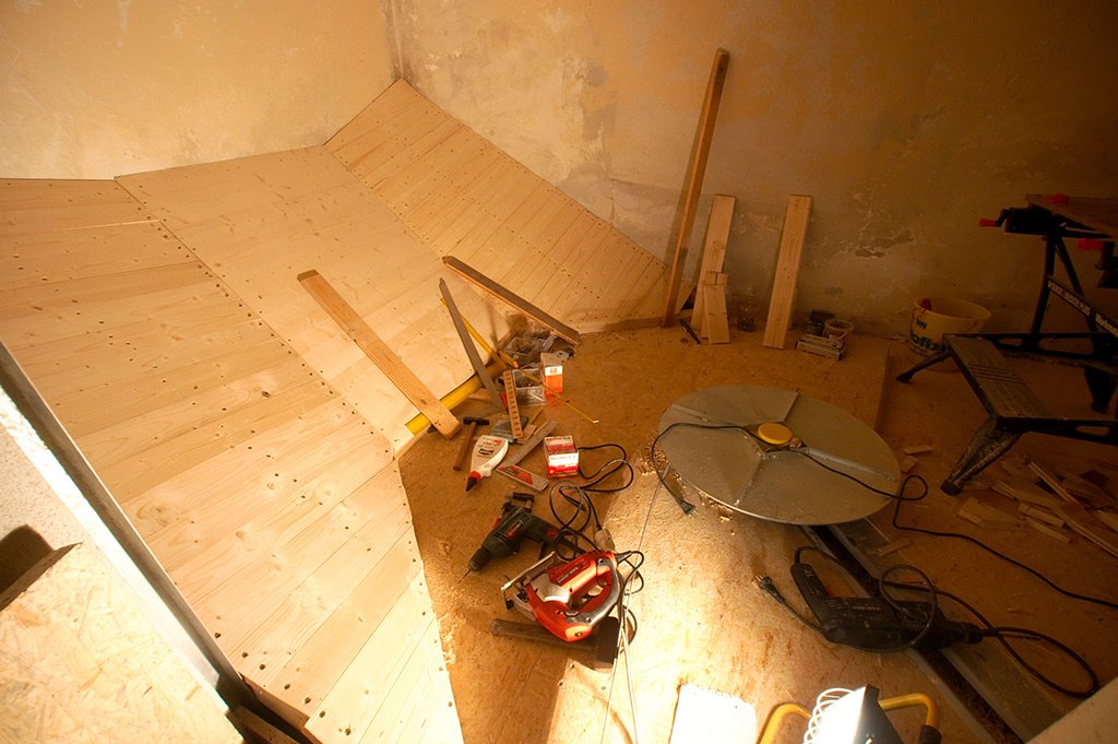 My father in law as house-owner was chief engineer while I worked as saw-servant and screw driver. The whole thing was made complicated by the existing floor that was already angled in two directions, so all metering had to take into account those non-horizontals and verticals. Furtheron leading the pellets to a circular transport area required sophisticated bended forms of the new flooring in order not to waste storage room.