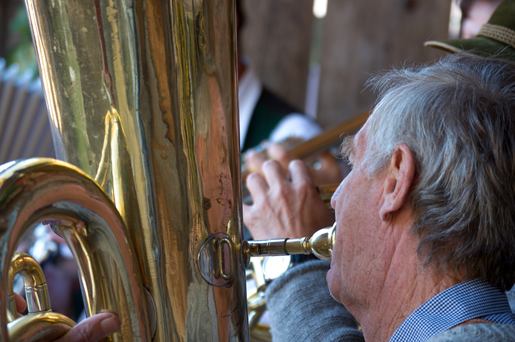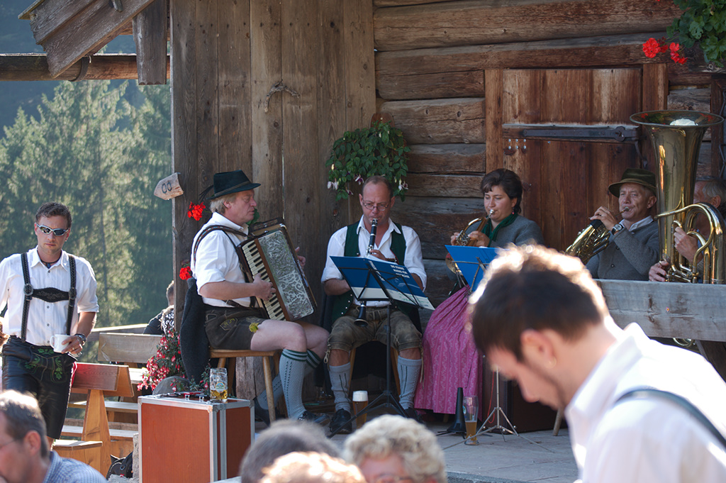 Beginning of october is the time of the return of livestock from high alpine summer pastures vulgo ‚Almabtrieb‘, and this is also the time for some small local festivities like the ‚Almfest‘ (alpine pasture festival) that we had today at the ‚Harbachalm‘ (here on google maps). A local traditional band was playing, no electricity and therefore no PA, only traditional tunes from the band, but also participation from the audience in form of vocals or interspersed songs accompagnied on a solo accordeon. The weather was fine, temperatures moderately high, the beer of the local brewery cold, the backlight demanding only for the photographer… Only the sanitary facilities were sub-standard, as my daughters complained. The OO-sign points to the respective appliance, consisting basically of a deep hole…