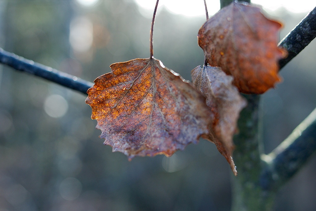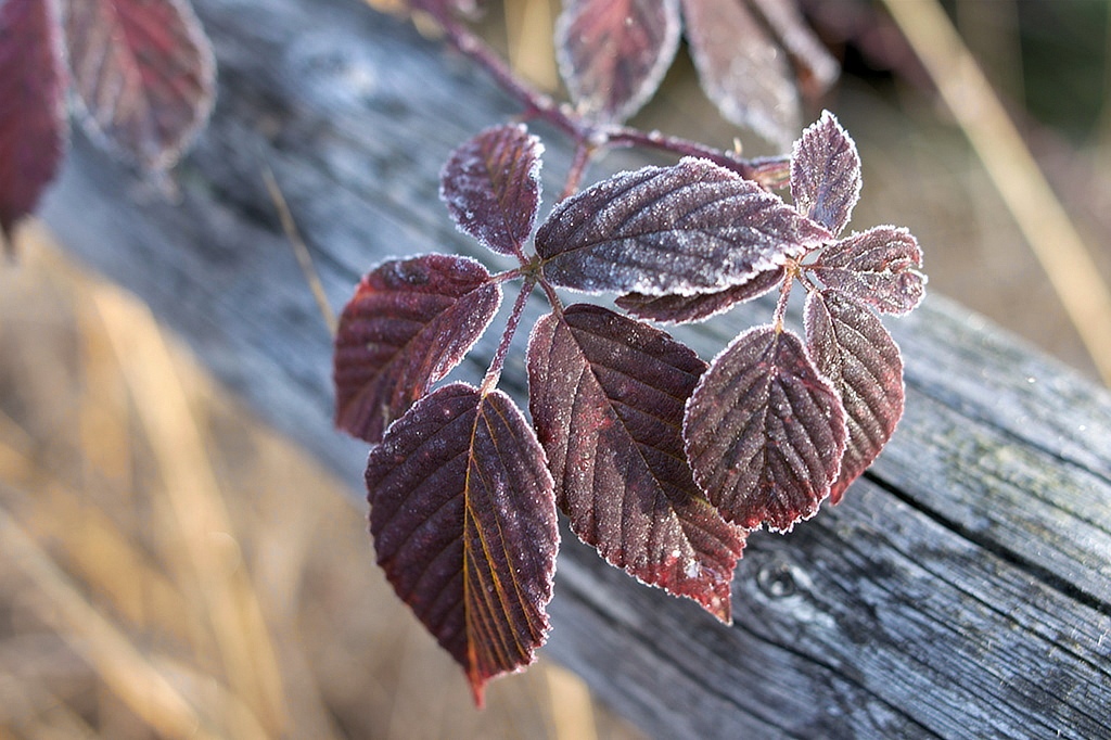 Despite of the frost the bramble leaves have kept a marvellous deep red, so deep that indeed I decided to turn down the saturation a bit in order to avoid an artificial ‚vivid‘ look that was significantly enhanced by the warm sunrise light. The birch leaves did not need such treatment, their thick and meanwhile dry material does not glow to the same extent as the bramble’s do.