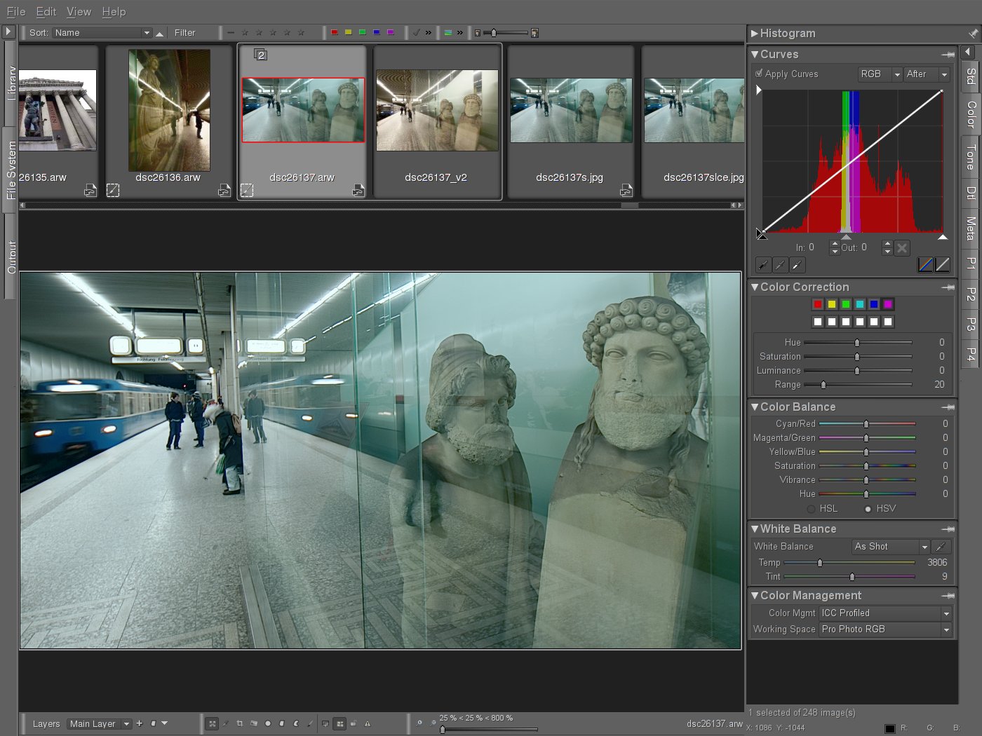 The raw image was converted in bibble5, and I used a LAB plugin to emphasize the greenish light. But for the last treatment I had to resort to digikam’s local contrast enhancement function, without it the image was too „flat“.