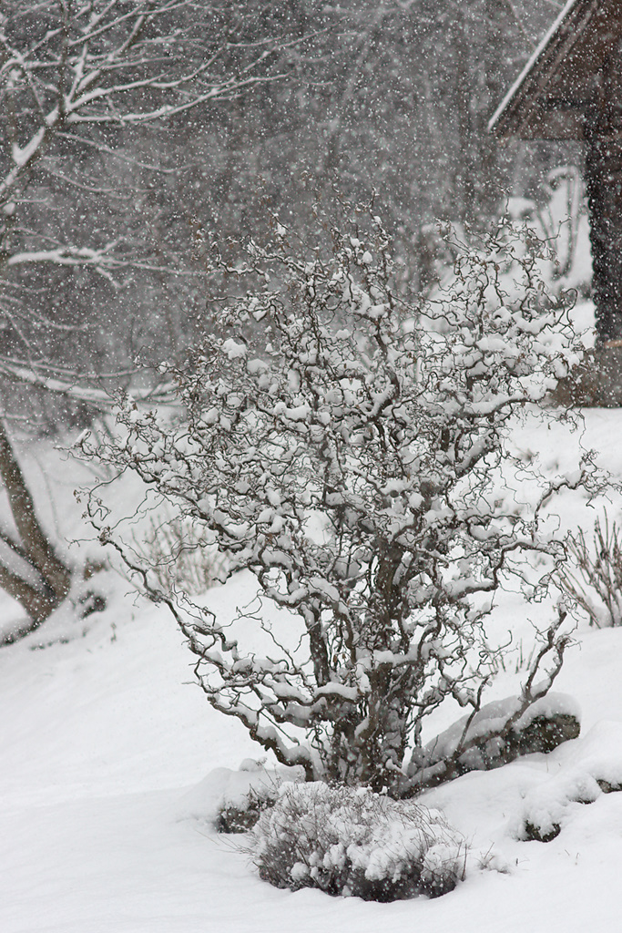March Blizzard(2). Tagged with Korkenzieher-Hasel, Schnee, blizzard, garden, hazel
