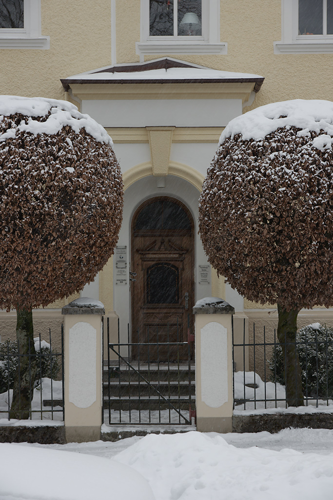 Winter seems to be coming through an end, but last week there was more than enough snow. What make me dig out that shot were the two trees in the front yard, so perfectly framing the entrance. The same stunning orb shape I found in the trees outside Freilassing train station (my weekly commuting hub). The red of the building’s paint here gets intensified by the low early morning sun, and whilst I usually try to keep my shadow out of the image, here I had to use it as a main element.