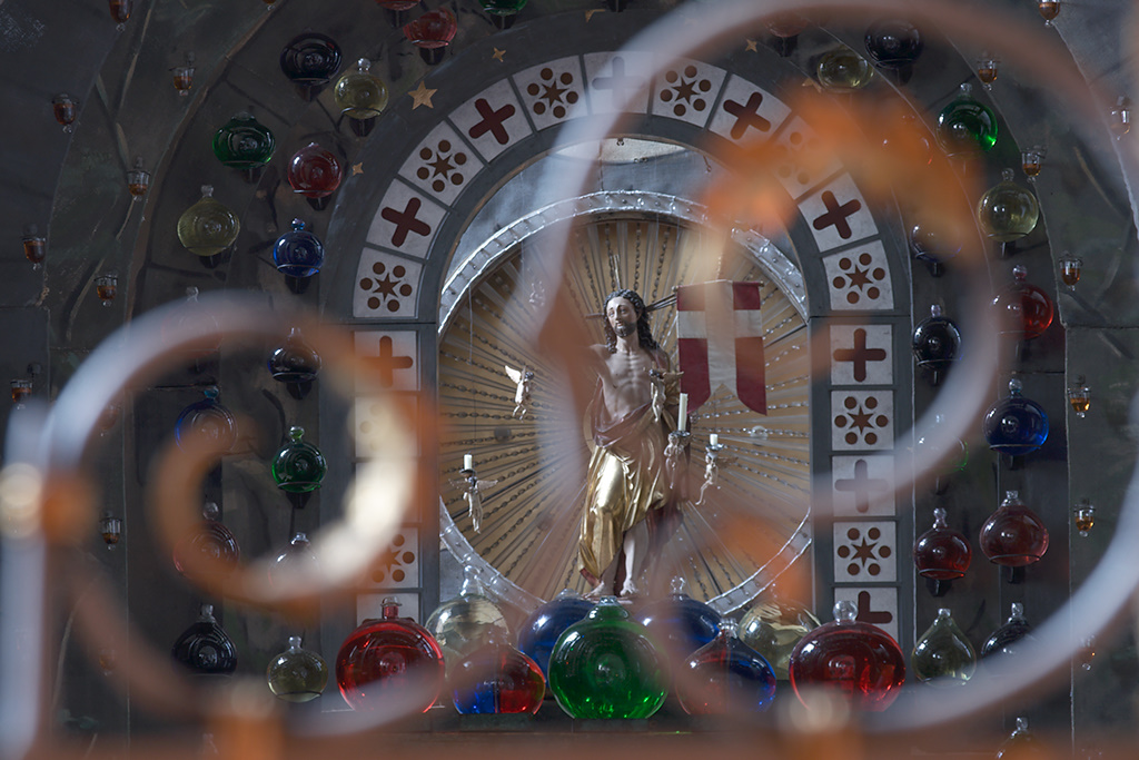 Enough digressing. The Holy Grave takes up the whole space of the Presbyterium of this rococo church, showing the grave of Holy Christ with the women mourning, while over this scenery in the deepest layer, the resurrected Christ in a bright vignette shows the triumph over death. The coloured glass balloons in the last image (white glass filled with couloured water) bundle the light when spotlighted and create an effect of glowing balls. A rotating „sun wheel“ and a small fountain provide additional effect.