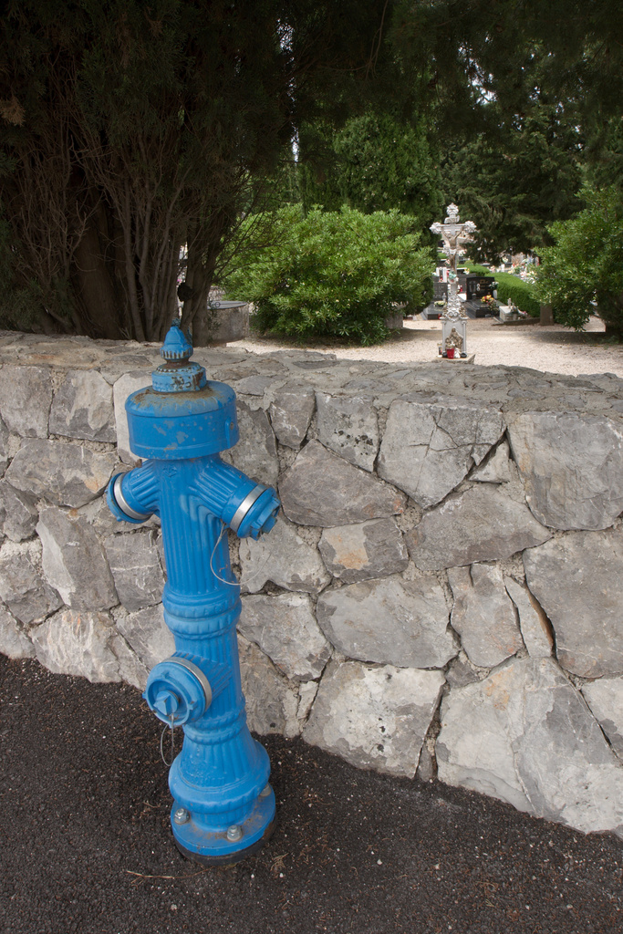In most places of the island of Krk, the fire plugs are painted in (weathered) red. But wherever new units are set up, the standard color is a fresh blue, clearly signalling water. And they do make up for nice focusing points in their surroundings.