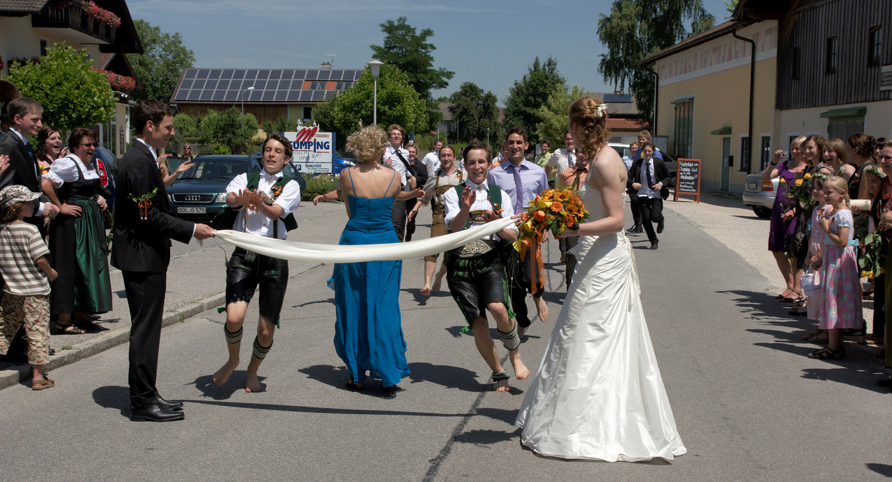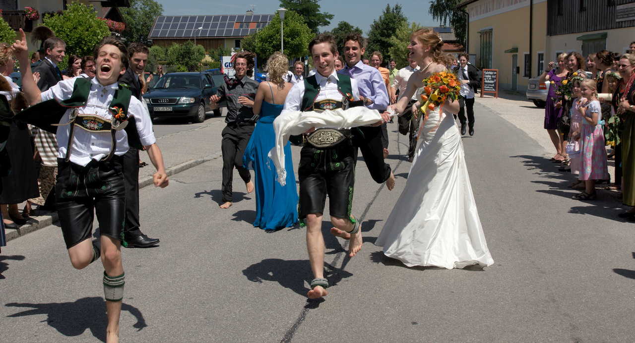 After having returned from church, again marching behind the brass band, and before entering the inn for the meal, a traditional „Burschenrennen“ – a race of the unmarried young men – was held. The price for the winner was a dance with the bride.