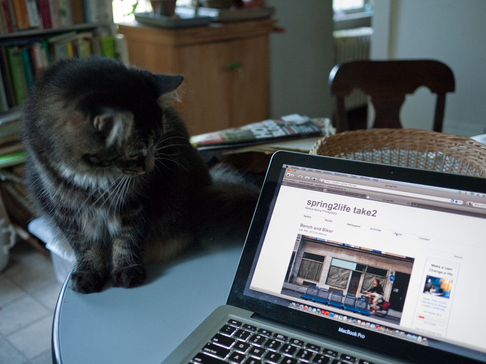 ¢ Carl Weese My friend Carl Weese sent me this image today: Their cat Marshall scrutinizing the last post on spring2life, probably checking if that small biker might make up a substitute for a mouse. Seems that spring2life has some renommee also with quadrupeds. Thanks Carl!