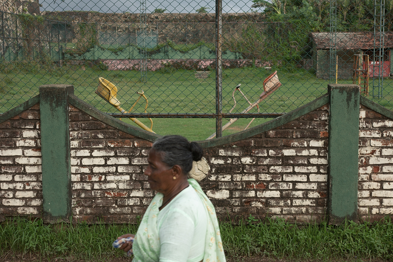 When I was framing the wall and seesaw behind it, I heard the steps coming. As she was coming from the right hand side, I didn’t see her with the open non-viewfinder-eye, And when she passed through the image, by some visceral reaction I triggered the shutter, therefore the sloppy „actuated itself“. For a fraction of a second I had thought where to put the focal plane, but left it at the wall. Now I am glad about this, I think it adds a certain strange, illogical aspect to the image.