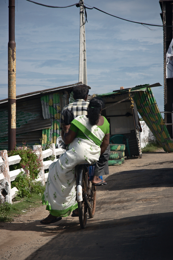 Approaching Lady Manning Bridge, built by the British in common wealthy colonial times to connect Batticaloa town with Kallady, one has to pass a number of military checkposts, indicated by the camouflage tin sheets. Fortunately enough the lady’s back provided a shield for my camera which would have otherwise drawn unnecessary attention from the soldiers onto it. My friend had to learn this the hard way in Colombo, when security staff on the boardwalk outside of the American Embassy’s wall noticed him looking through the viewfinder… We were happy that they were content to get a photocopy of his passport.