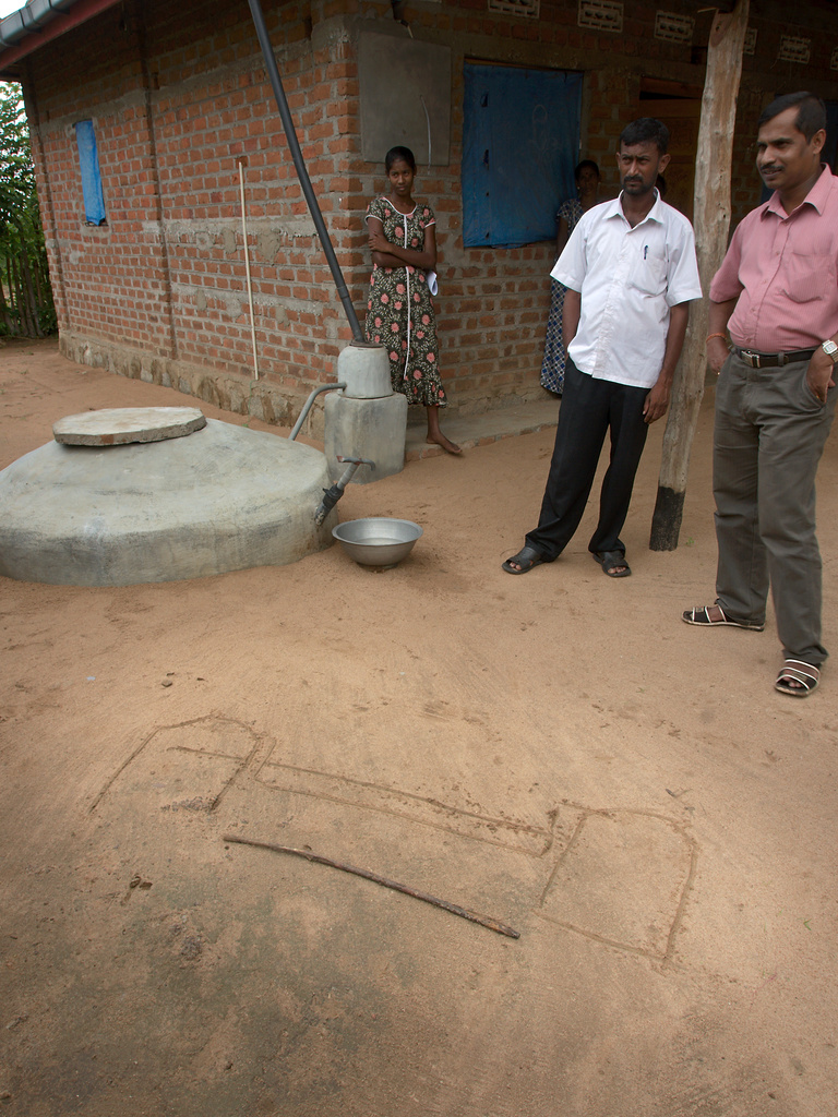 When visiting one of the rainwater harvesting project sites, questions came up of how to supply those parcels with water, where there is only a hut with a thatched roof – in these places usually the most needy people live. After some discussion back and forth an archaic solution was brought up and displayed in a similarly archaic way: by drawing it with a stick in the sand.