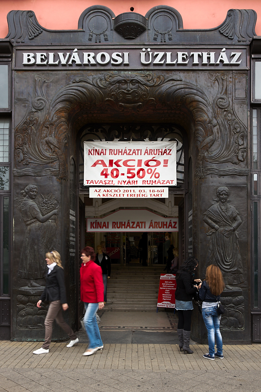The store with the hard-to-pronounce name (at least for non-Hungarians) seems to be part of a large chain of shopping malls. When it comes to attract the bargain hunting crowd, the inner part of the art nouveau entrance is just a suitable area for a big banner shouting ‚Discount‘.