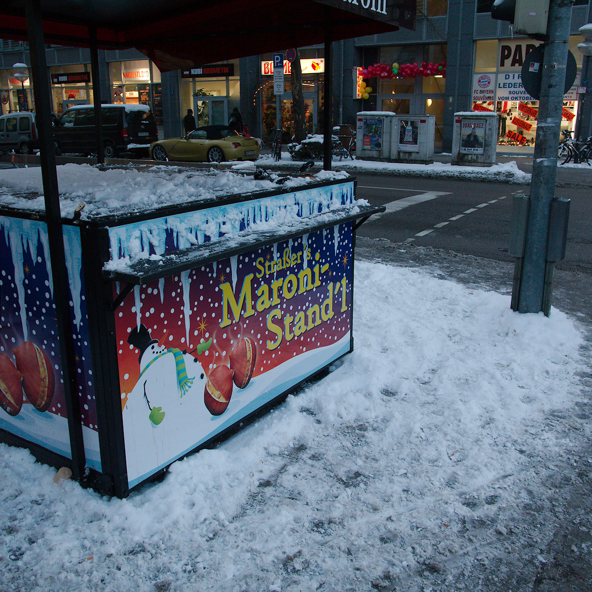 The snowfall that decorated the booth in this picture happened already last week. Together with the following frost it substantially slowed down street life in the center of Munich, to the extent that the street vendors closed some of their outlets because only smallest numbers of visitors wanted to stop and buy some food in that excessive cold.