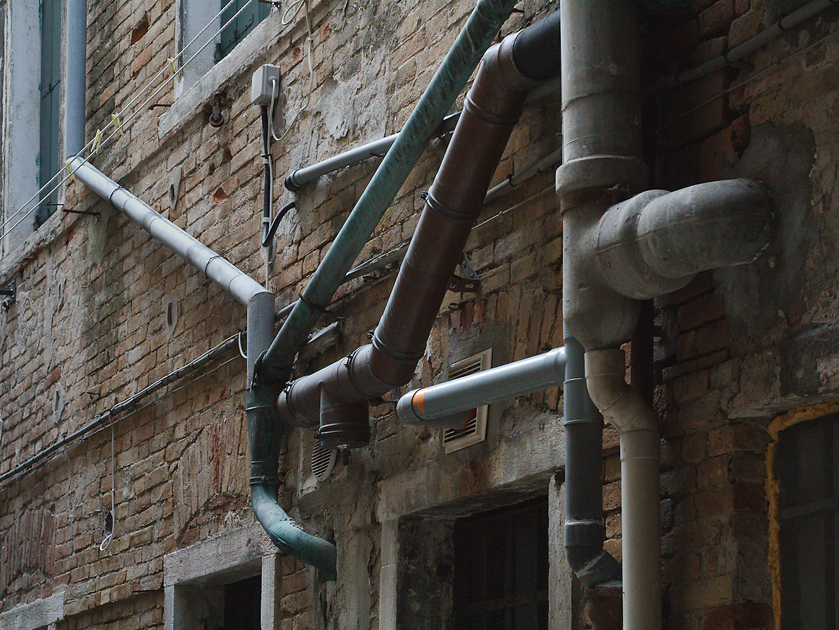 Tony, for me it shows a bit of organic growth over the decades. Whenever a new gadget was installed, the extended the setup. And such before-the-wall-installations are a clear sign of a moderate climate – in Germany, the deep winter temperatures would clearly forbid such an arrangement of pipes.
