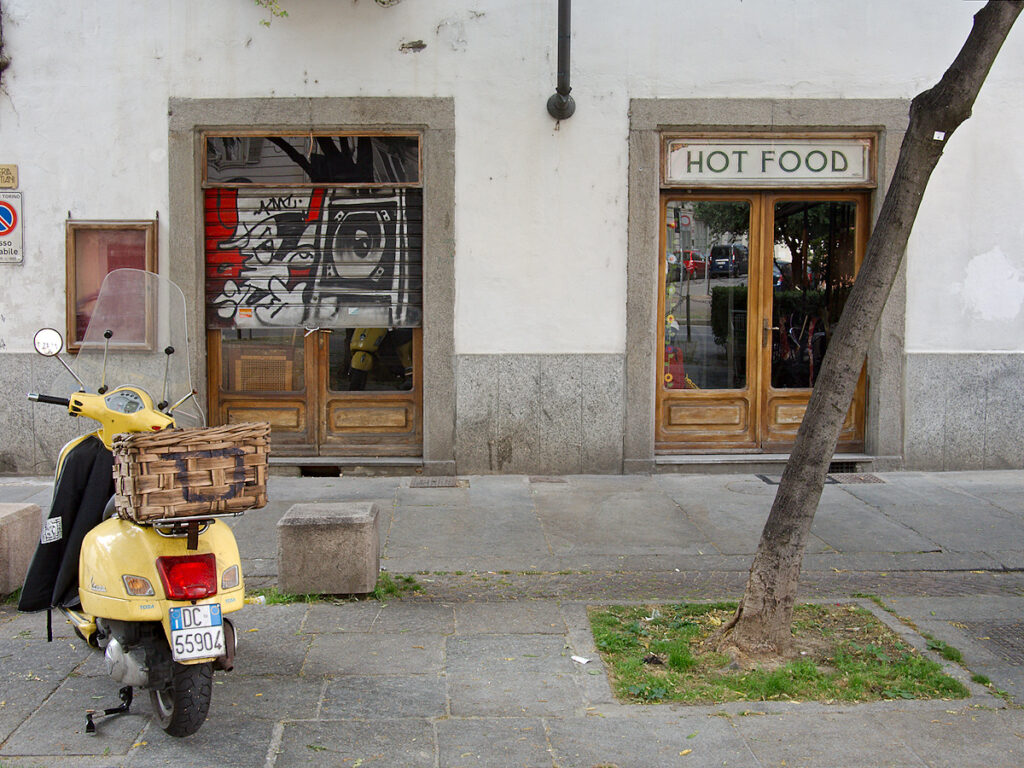 Excellent urban scene, I love all the random elements like the tree, the moped shop sign and so on, all brilliantly composition.