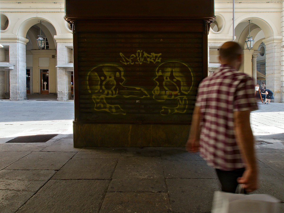 Markus, nice picture. The passing pedestrian breaks the symmetry and adds interest. The graffiti is interesting as well as the classic architecture in the background.