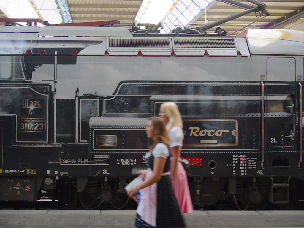The airbrushed steam engine on the electric locomotive is pure fake, but seems to serve the widespread longing for the „good old times“ (which clearly weren’t that good at all), and the dirndls on the dirndls (in Bavarian, dirndl is both a certain frock and the idiom for ‚girl‘), well, those seem to be not obviously of the cheap surrogate type – abundant in Octoberfest times – but are owed as well to that retro mood. Bavaria now is proud of the successful combination of laptop and short leather pants, and whilst nobody wants back into the narrow minded times of 200 years ago, sometimes at least a superficial nostalgia is there.