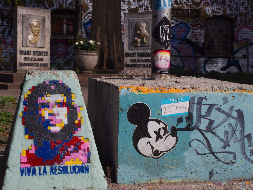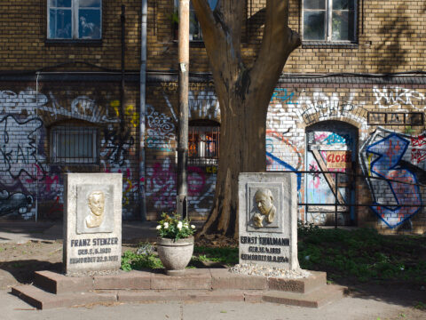 In one of the biggest railway workshops in (former East-)Germany, a memorial for two of the most important communist politicians in the Third Reich, Ernst Thälmann and Franz Stenzer, only recently was uncovered from the weeds that overgrew it since the shutdown of the workshop in 1995. Present subculture had to leave it’s odor mark there, too. Reassuring enough, they did it tongue-in-cheek.