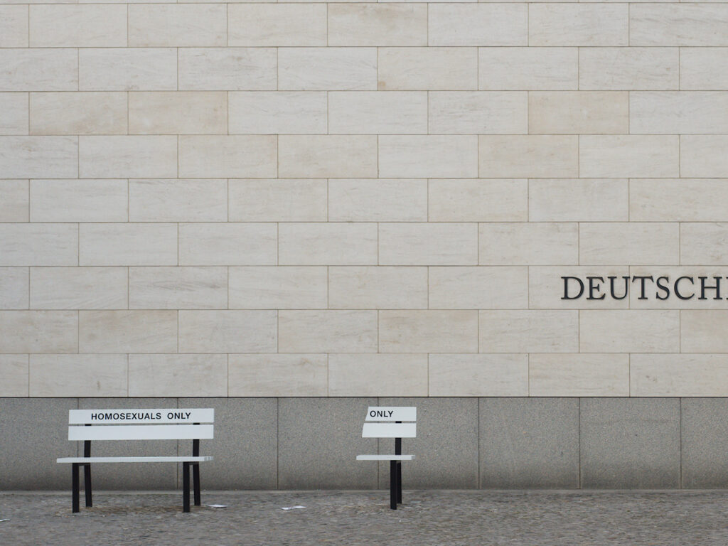 „Deutsch“ – aber die Beschriftung der Bänke in Englisch – gilt nur für Ausländer? Wie wird geprüft, ob der/die BankbenuzterInnen homosexual sind 😉 ? Gut gesehene und präsentierte Alltagsszene!