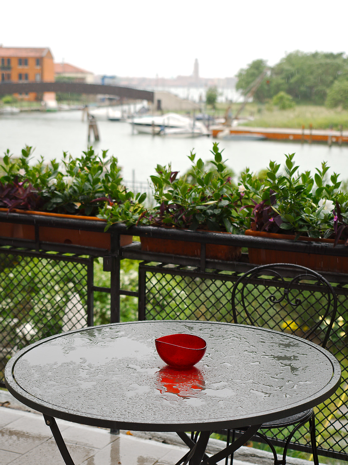 Many years ago we spent an afternoon at the Murano glass factory. I thought the glass material just beautiful, but the design of some pieces less pleasing than the glass itself. This red bowl looks great. Also like the composition of your photo. Good your stay turned out well.