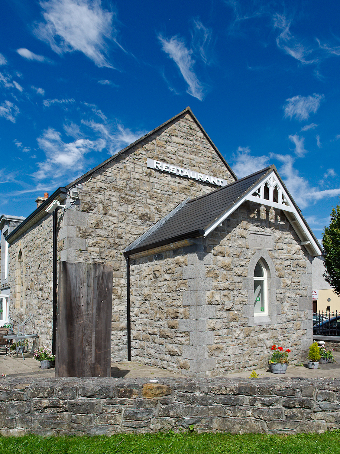 Interesting photo of this little stone building. It has had a number of lives that started with religion, and then became a restaurant. The blue sky and red flowers in the pot softens the hardness of the stone. I see a CCTV on the corner. Perhaps the restaurant kept watch on customers on the patio?