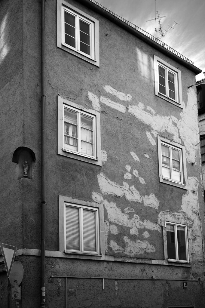 1. Eine Außenhaut mit Narben. Fassade, faccia: Gesicht.