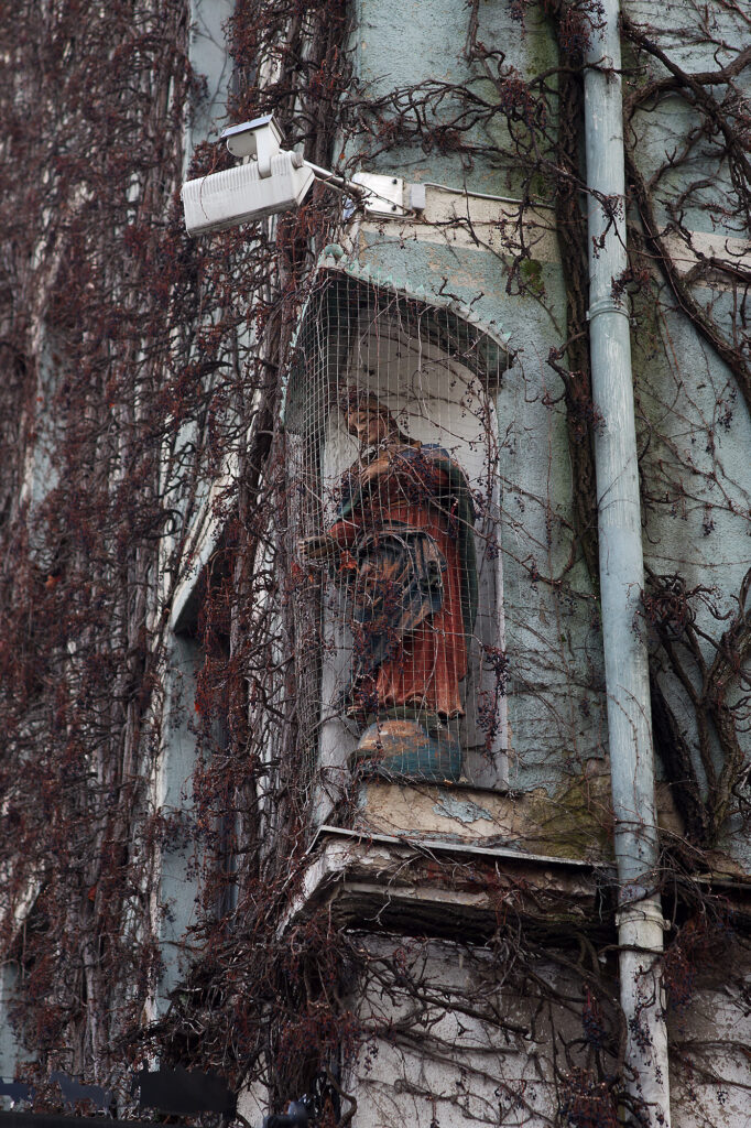 1. Die Schutzpatronin braucht selber Schutz, vor den ganz und gar unheiligen Tauben und der Kletterpflanze. Aber gut beleuchtet scheint sie zu sein. Wohl dem Gemeinwesen, das seine öffentlichen Skulpturen derart schützen und inszenieren kann.?