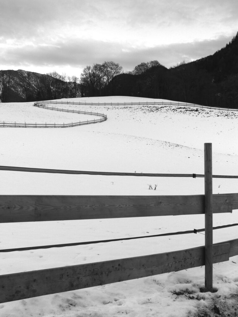 Ein perfekt gewählter Ausschnitt: Wird der Blick zunächst noch vom Bretterzaun begrenzt, so kann er, wenn der Kopf sich hebt, umso freier den Kurvaturen des anderen Zauns folgen, seiner linearen Dynamik, und zuletzt im bewegten Profil des Waldes und der Berge in der Ferne ausschwingen.