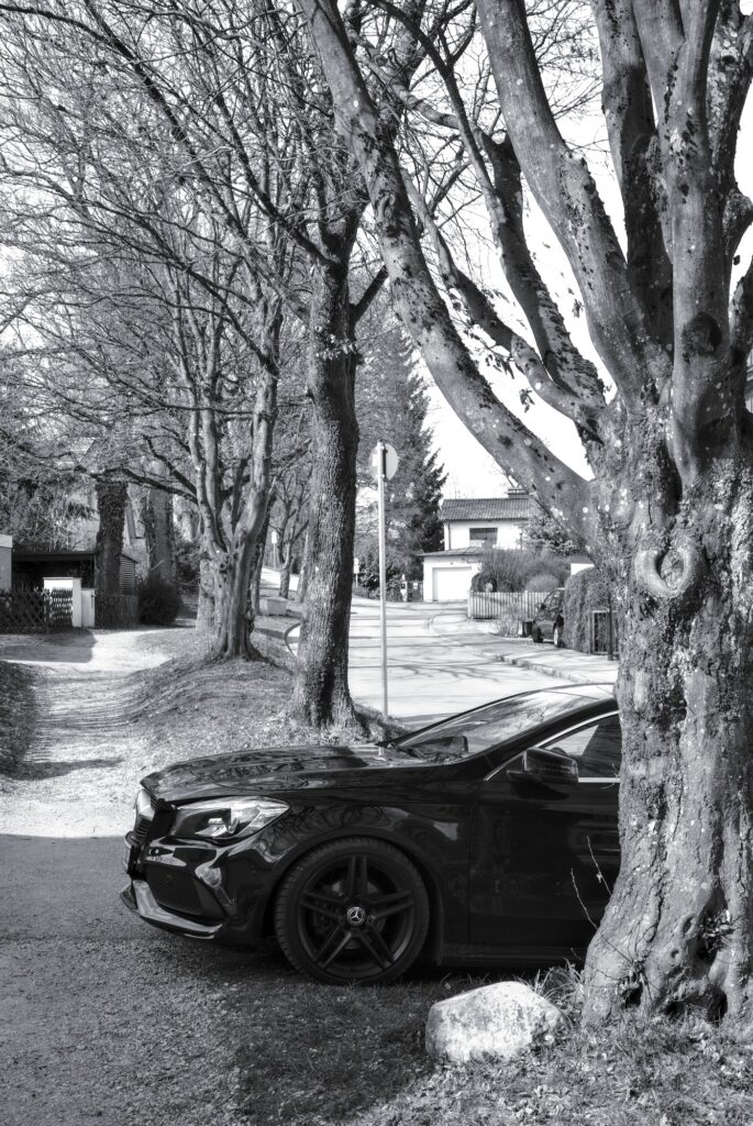 I enjoyed the contrast between the car’s glossy surface and the gnarled bark of the trees. Small joys in pandemic times…