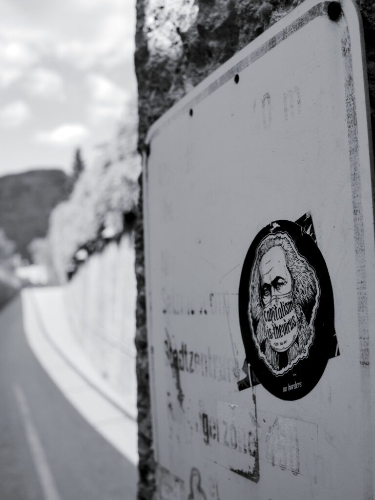 1. Jeff, given that stickers tend to, no, have to simplify, I read this as dissatisfaction with capitalism, salted with some provocation in the form of the Marx portrait.