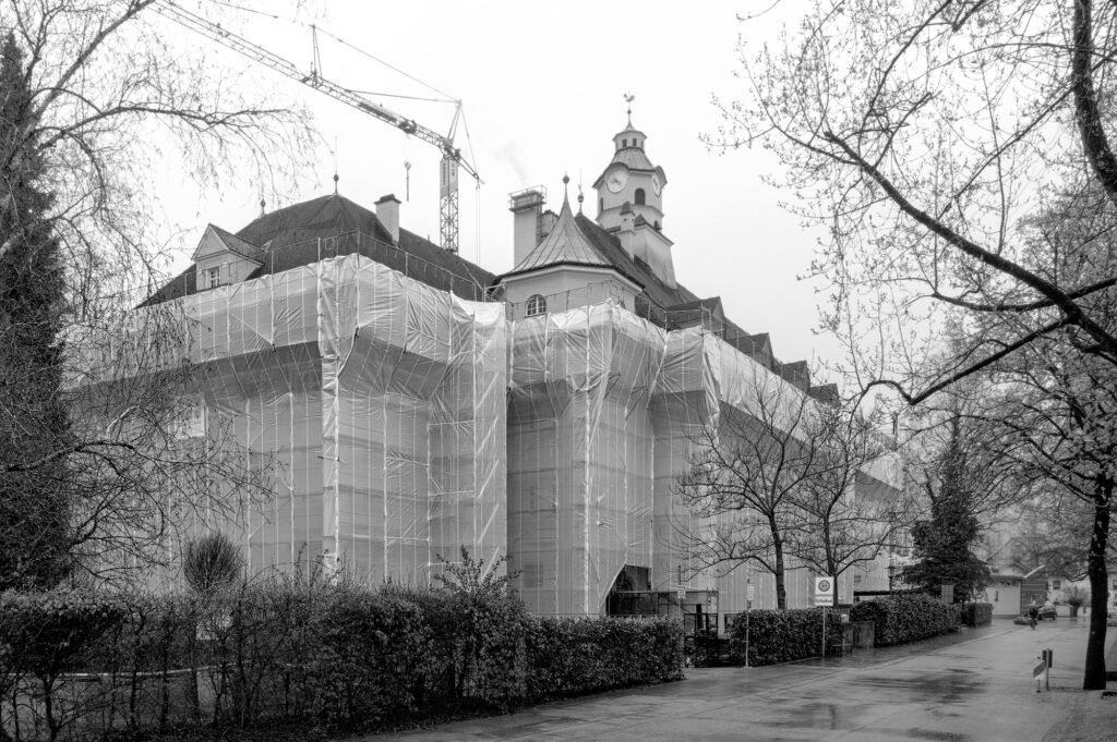 @JoFer, Uwe: Erstaunlich jedenfalls, wie die Verhüllung die Anmutung des Gebäudes – in meinen Augen Richtung Schloß oder Burg – verändern kann. Der Gerüstbauer hatte definitiv keine künstlerischen Ambitionen und hat doch temporär einen Hingucker geschaffen