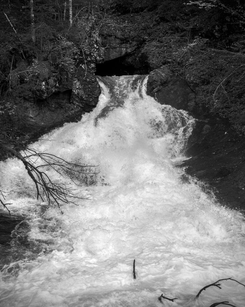 The „Schwarzbach“ (black creek) shoots out of a cave in the mountain, in springtime with a lot of water due to the melting snow.