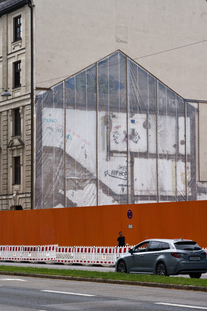 Markus, It took me a moment to realize what I was seeing: a neighboring attached building demolished with a plastic covering over the previously shared wall. Interesting, well-seeded, and captured.