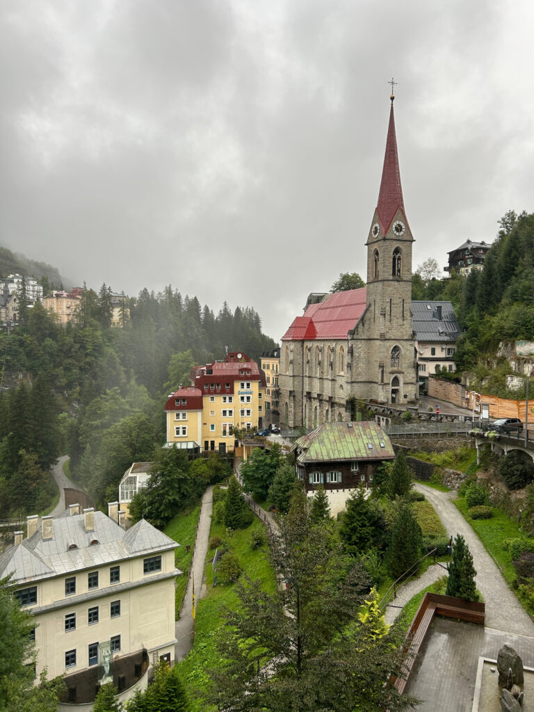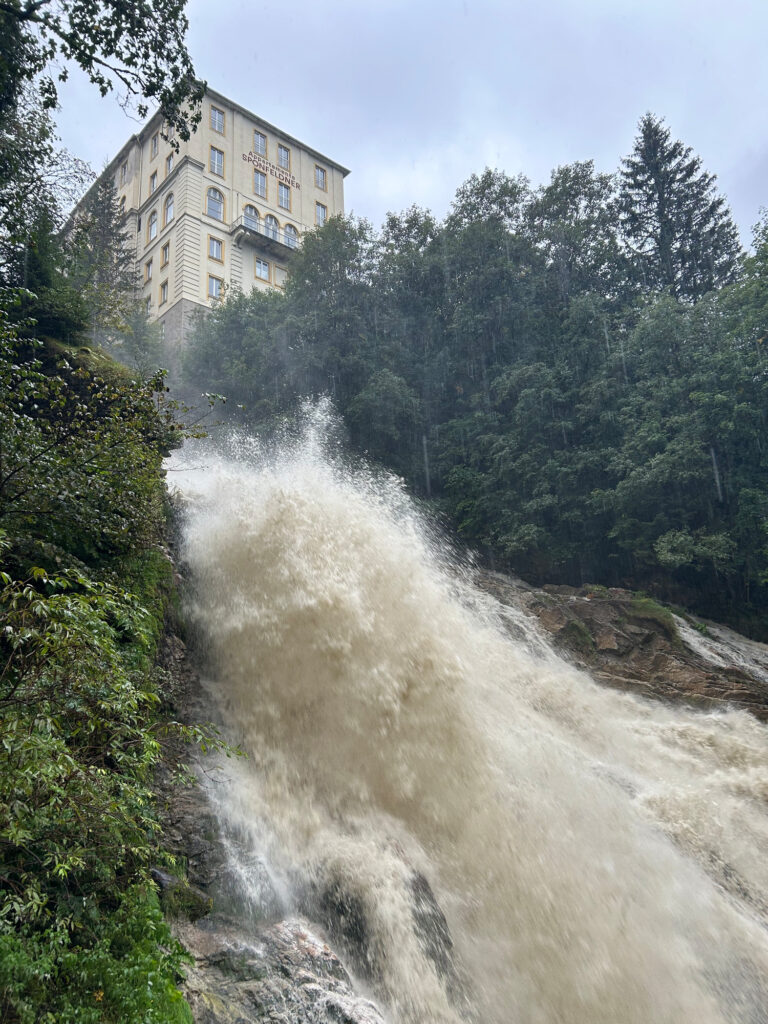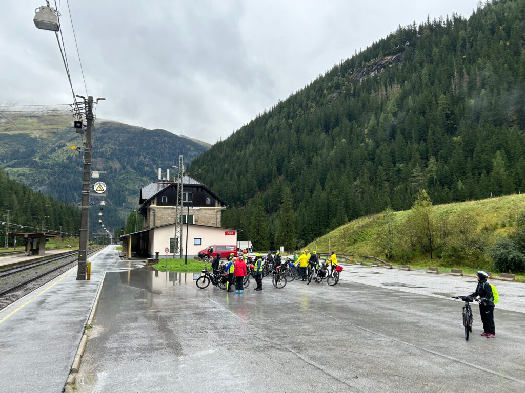 The third day started rainy, with a walk through Bad Gastein as we were scheduled for the shuttle train undercutting Tauern mountains in the early afternoon only. There is a cascade in the middle of the village, which was filled already with brown waters due to the rain. At the foot of the cascade sits a old power plant that is converted now into a café.