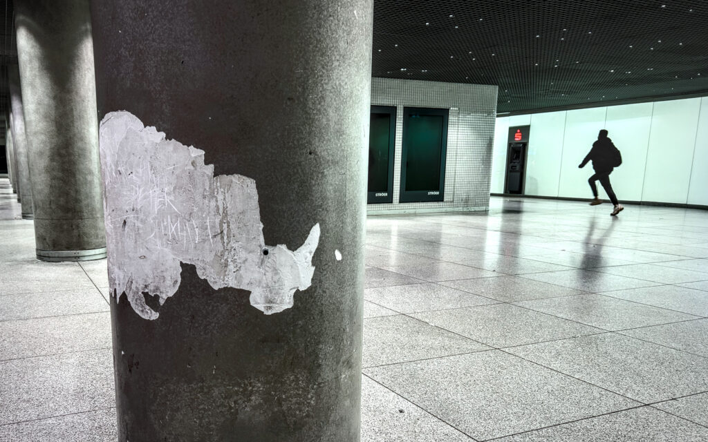 My commuting time comes to a end with only ~ 20 working days left. Will I miss commuting? Certainly not, I had more than my share of train delays etc. But the photographic opportunities certainly were (and are) there in masses, like last Saturday when leaving the subway and walking to the office at 06:00 in the morning. I had already passed that pillar but decided to turn around and use at least the phone for a snapshot. So luck met non-preparation here…